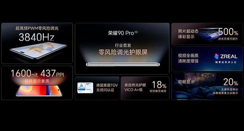 此次發(fā)布會帶來了榮耀90和榮耀90 Pro,全系首發(fā)搭載了2億像素寫真相機,以及3840Hz超高頻PWM零風險調(diào)光功能。榮耀終端有限公司 CEO 趙明先生稱,這次的榮耀 90 系列,他們希望在影像(2 億像素寫真相機)、屏幕(3840Hz 超高頻 PWM 零風險調(diào)光護眼屏)、續(xù)航(5000mAh 高密度超大容量電池)這三個領域有所突破。