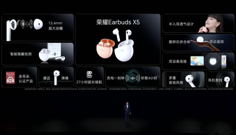 發(fā)布會上,榮耀還帶了一款Earbuds X5耳機新品,采用了鵝卵石狀倉體,提供釉白色和珊瑚粉兩款配色。耳機采用了半入耳設計,單只僅重3.8g,帶來空氣感舒適佩戴體驗。Earbuds X5采用了13.4mm動圈單元,復合鍍鈦振膜,呈現(xiàn)純正音質(zhì),并通過金耳朵產(chǎn)品認證。Earbuds X5提供了27小時超長續(xù)航,充電一刻鐘,可以支持4小時聽歌體驗。